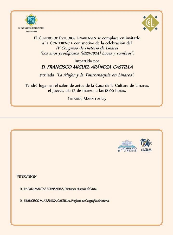 PRÓXIMA CONFERENCIA DEL DÍA 13 DE LOS CORRIENTES, A CARGO DE D. FRANCISCO MIGUEL ARÁNEGA CASTILLA, TITULADA "LA MUJER Y LA TAUROMAQUIA EN LINARES". CASA DE CULTURA A LAS 18 H.