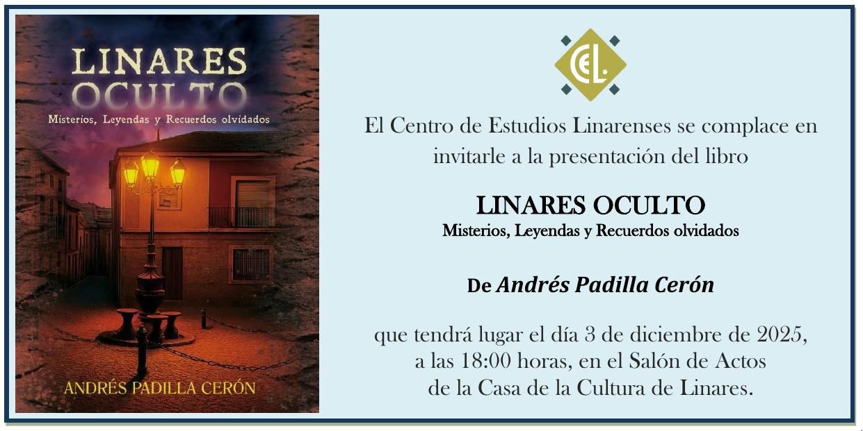 PRESENTACIóN DEL LIBRO DE D. ANDRéS PADILLA CERóN, CONSEJERO ACADéMICO DEL CEL, LINARES OCULTO. PRóXIMO DíA 3 DE DICIEMBRE, A LAS 18 H., EN LA CASA MUNICIPAL DE CULTURA DE LINARES.